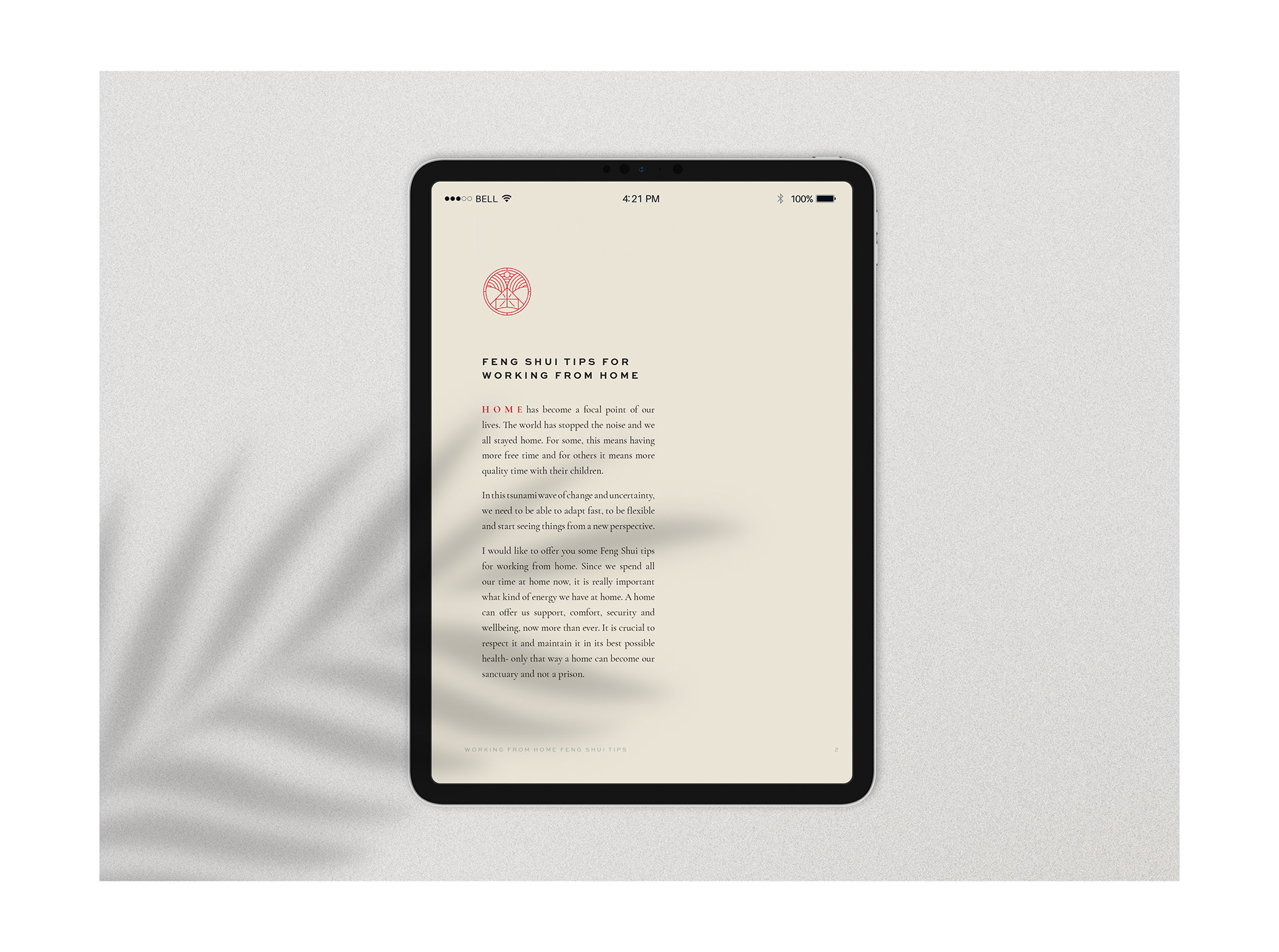 An identity translating Feng Shui's authentic and accurate approach into a visual format with a clean look, spaciousness and softness. Colour scheme follows its connection to nature and Chinese origin.